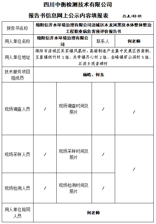 綿陽(yáng)信開(kāi)水環(huán)境治理有限公司涪城區(qū)木龍河黑臭水體整體整治工程職業(yè)病危害預(yù)評(píng)價(jià)
