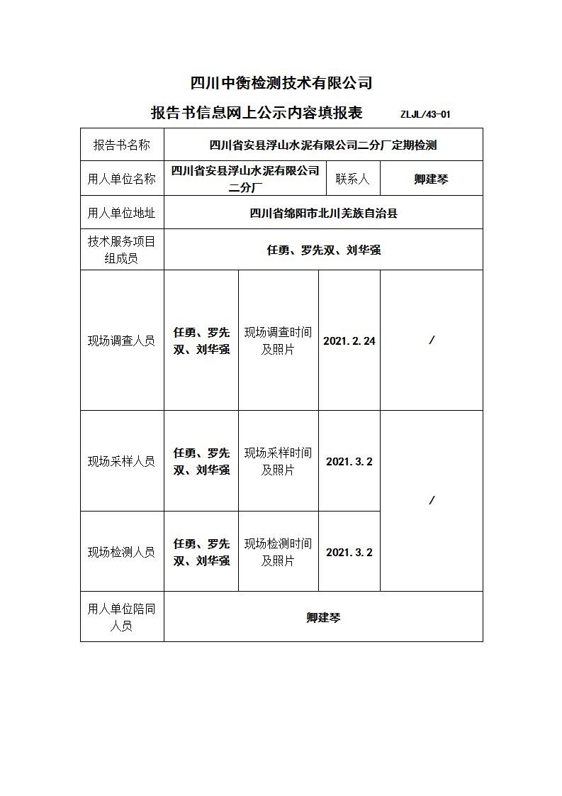 四川省安縣浮山水泥有限公司二分廠職業(yè)病危害定期檢測