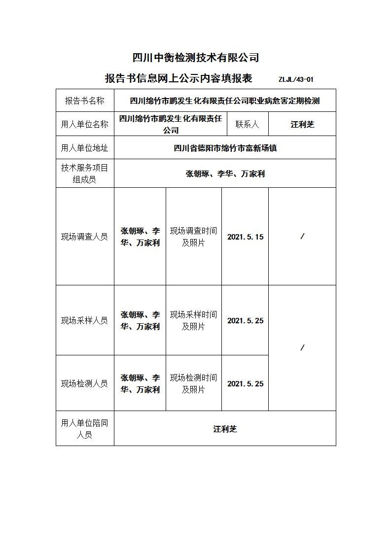 四川綿竹市鵬發(fā)生化有限責(zé)任公司定期檢測