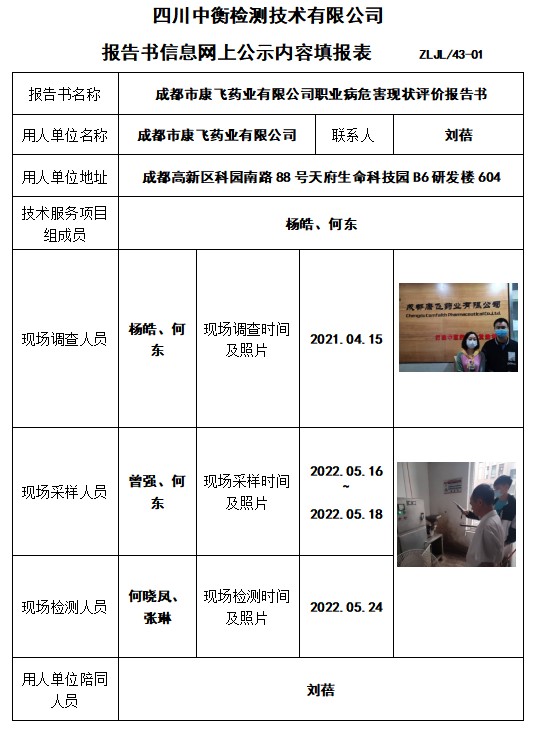 成都市康飛藥業(yè)有限公司職業(yè)病危害現(xiàn)狀評價