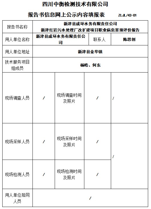 新津縣成環(huán)水務(wù)有限責(zé)任公司 新津紅巖污水處理廠改擴(kuò)建項(xiàng)目職業(yè)病危害預(yù)評(píng)價(jià)