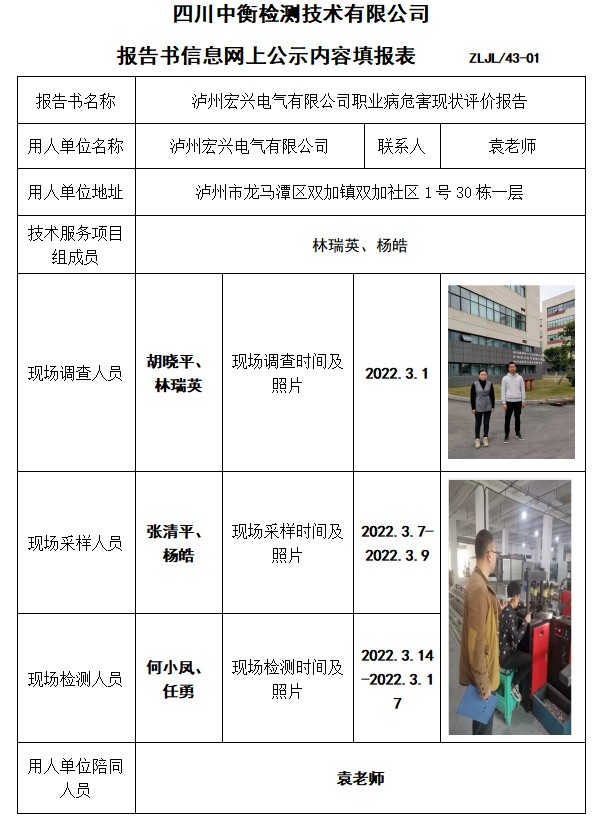 瀘州宏興電氣有限公司職業(yè)病危害現(xiàn)狀評價