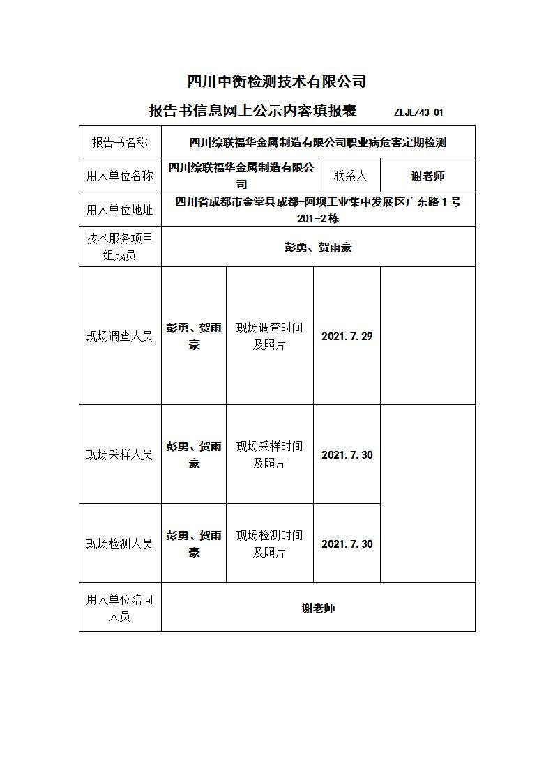 四川綜聯(lián)福華金屬制造有限公司職業(yè)病危害定期檢測(cè)