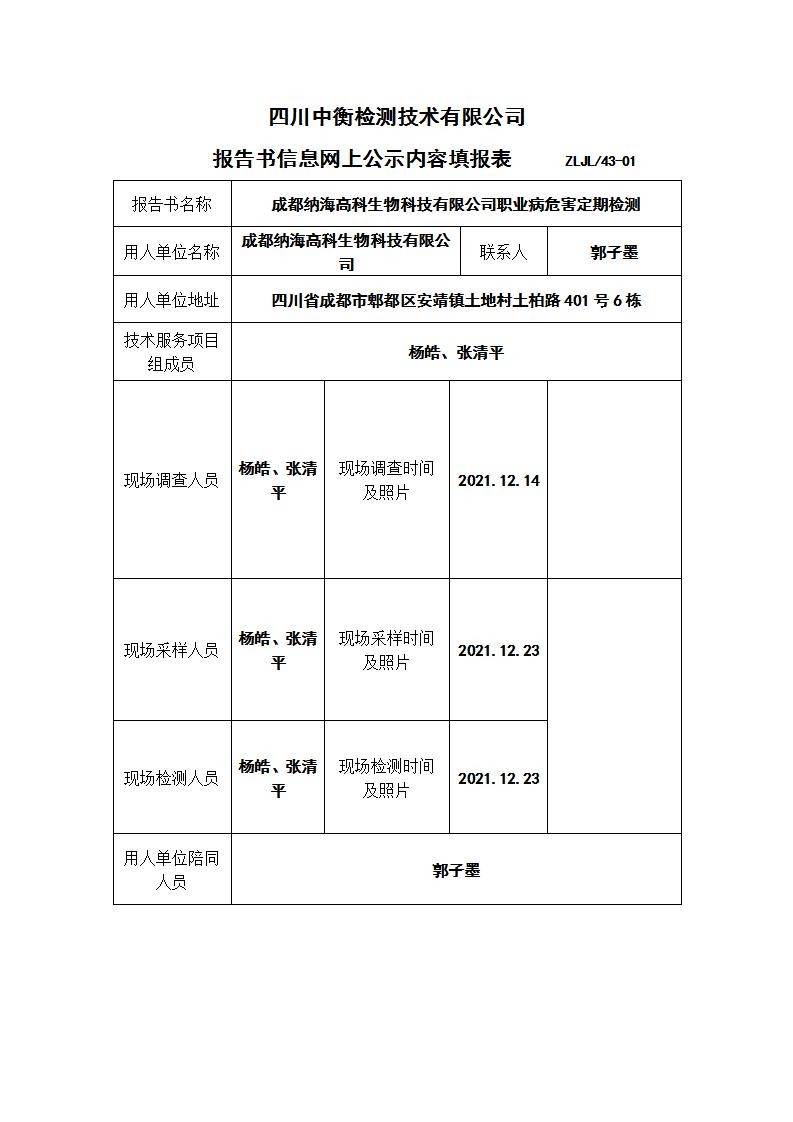 成都納海高科生物科技有限公司職業(yè)病危害定期檢測