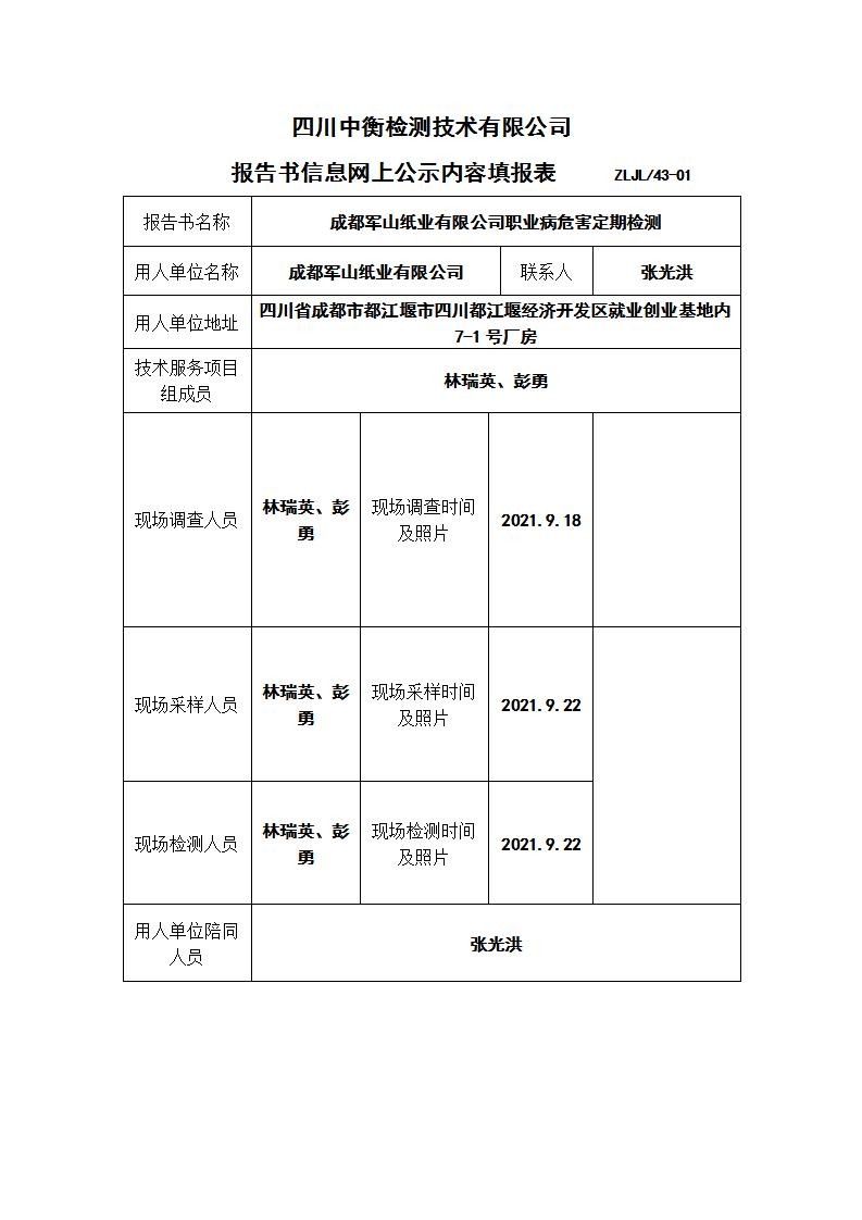 成都軍山紙業(yè)有限公司職業(yè)病危害定期檢測(cè)
