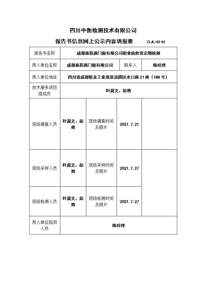 成都森躍通門窗有限公司職業(yè)病危害定期檢測(cè)