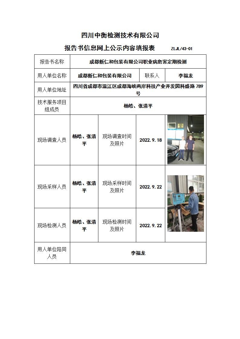 成都新仁和包裝有限公司職業(yè)病危害定期檢測