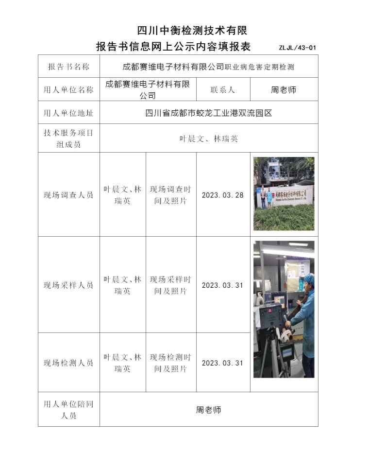 成都賽維電子材料有限公司職業(yè)病危害定期檢測(cè)