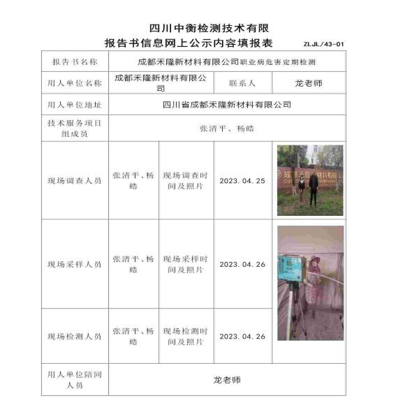 成都禾隆新材料有限公司職業(yè)病危害定期檢測