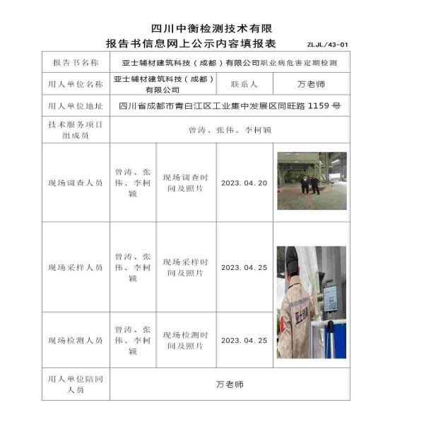 亞士輔材建筑科技(成都)有限公司職業(yè)病危害定期檢測(cè)