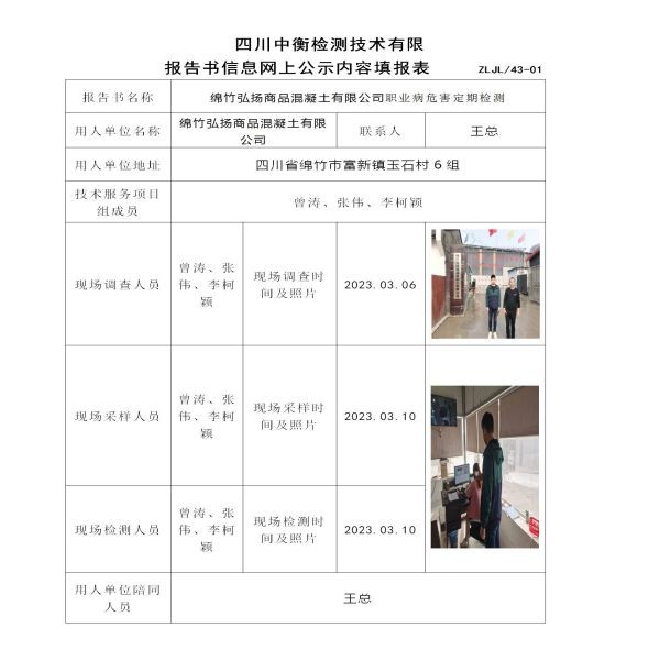 綿竹弘揚商品混凝土有限公司職業(yè)病危害定期檢測