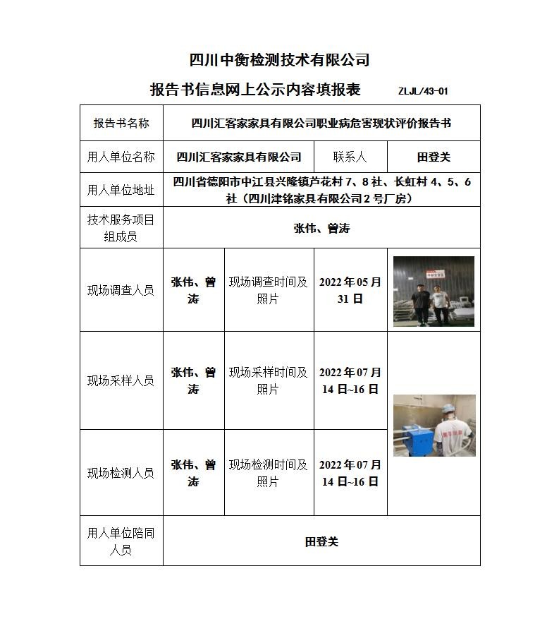 四川匯客家家具有限公司職業(yè)病危害現(xiàn)狀評價