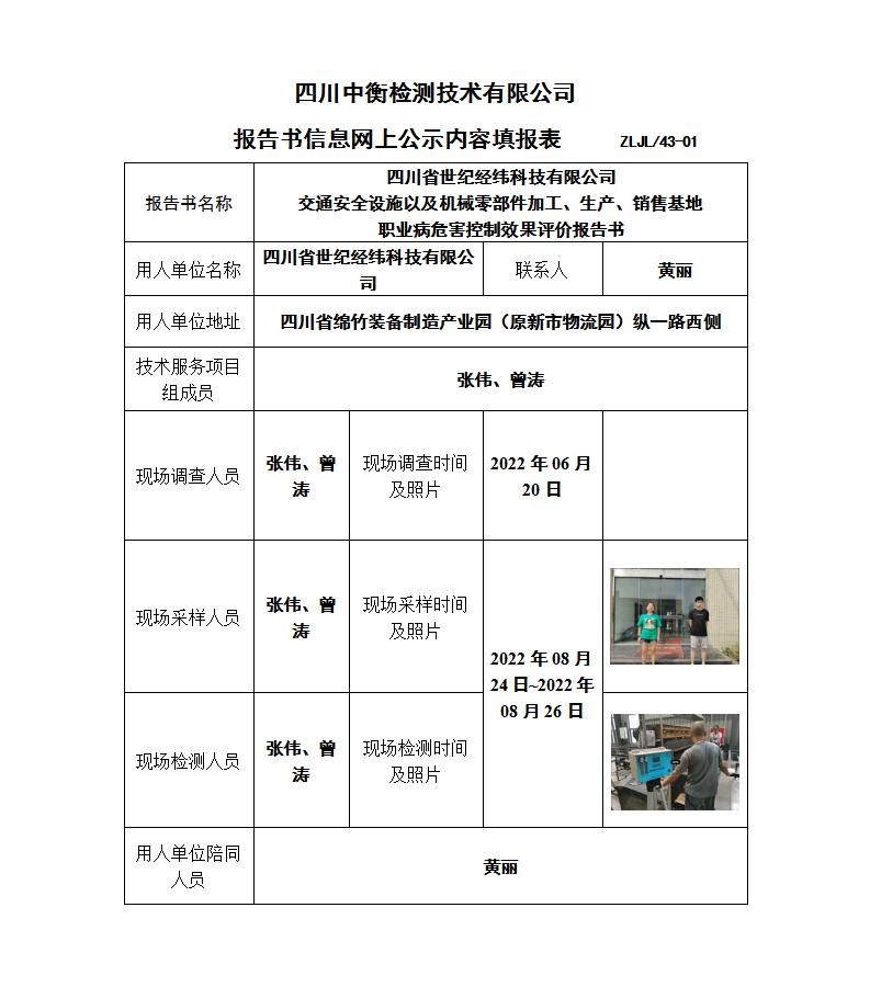 四川省世紀(jì)經(jīng)緯科技有限公司 交通安全設(shè)施以及機械零部件加工、生產(chǎn)、銷售基地 職業(yè)病危害控制效果評價