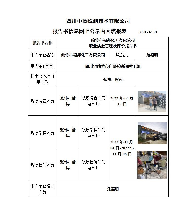 綿竹市福邦化工有限公司 職業(yè)病危害現(xiàn)狀評價