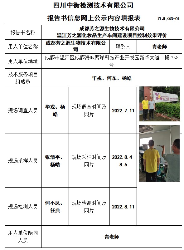 成都芳之源生物技術(shù)有限公司 溫江芳之源化妝品生產(chǎn)車間建設(shè)項(xiàng)目控制效果評價