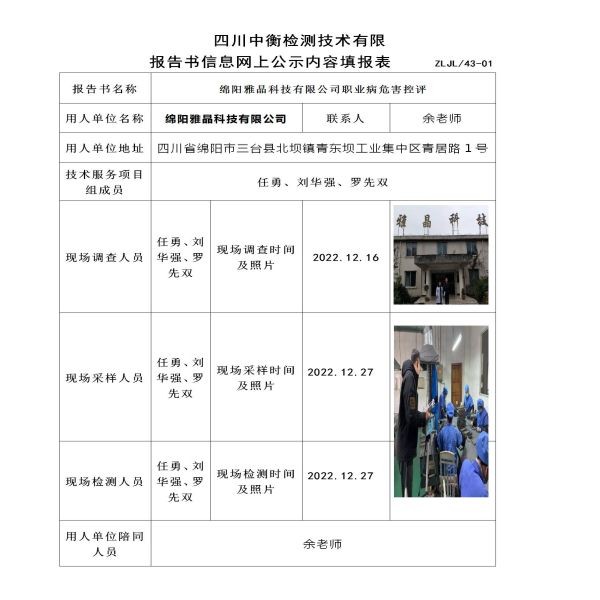 綿陽雅晶科技有限公司定期檢測