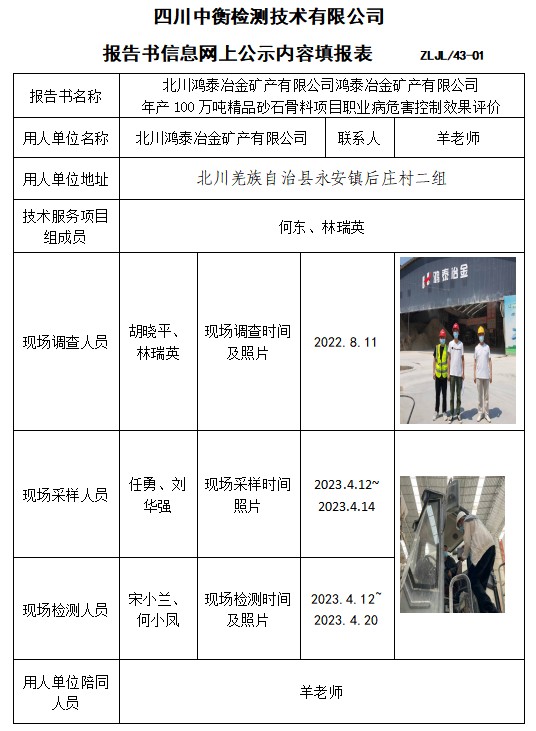 北川鴻泰冶金礦產(chǎn)有限公司鴻泰冶金礦產(chǎn)有限公司 年產(chǎn)100萬噸精品砂石骨料項目職業(yè)病危害控制效果評價