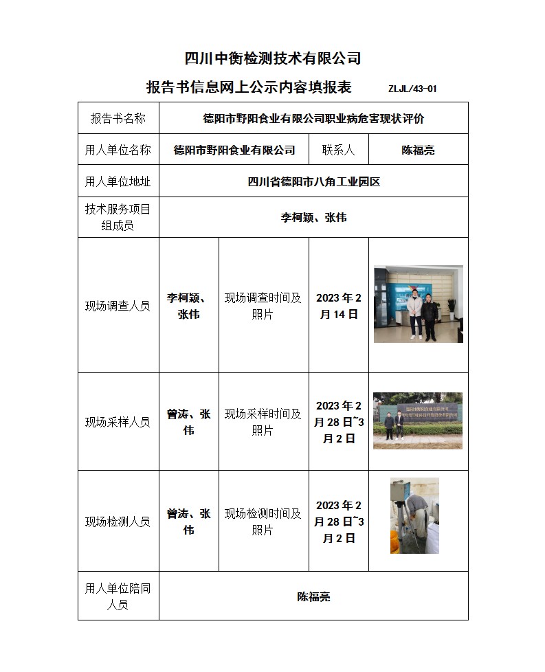 德陽市野陽食業(yè)有限公司 職業(yè)病危害現(xiàn)狀評價(jià)報(bào)告