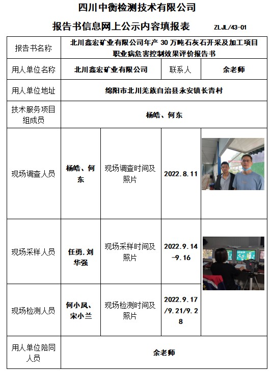 北川鑫宏礦業(yè)有限公司年產(chǎn)30萬噸石灰石開采及加工項目職業(yè)病危害控制效果評價報告書