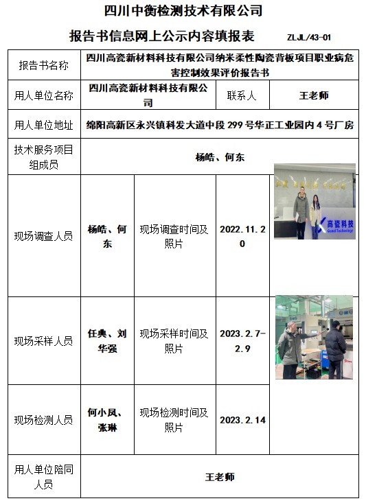 四川高瓷新材料科技有限公司納米柔性陶瓷背板項(xiàng)目職業(yè)病危害控制效果評(píng)價(jià)報(bào)告書(shū)
