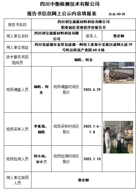 四川利寶康新材料科技有限公司 職業(yè)病危害現(xiàn)狀評價報(bào)告書