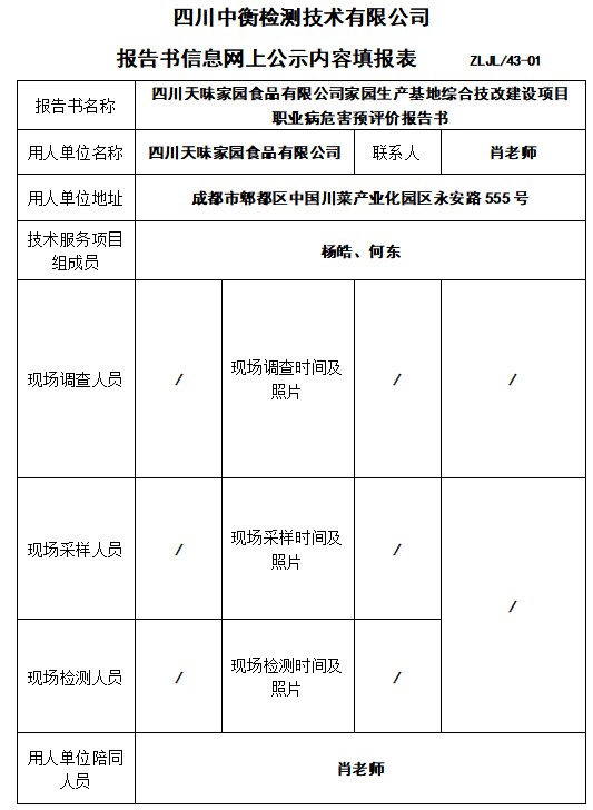 四川天味家園食品有限公司家園生產(chǎn)基地綜合技改建設(shè)項目職業(yè)病危害預(yù)評價報告書