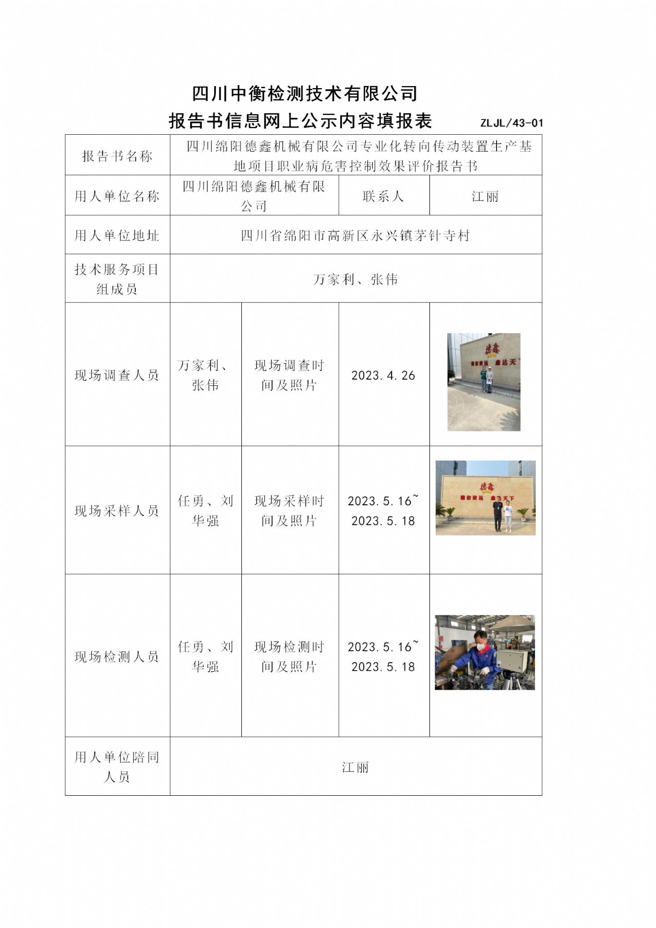 四川綿陽德鑫機(jī)械有限公司專業(yè)化轉(zhuǎn)向傳動(dòng)裝置生產(chǎn)基地項(xiàng)目職業(yè)病危害控制效果評價(jià)