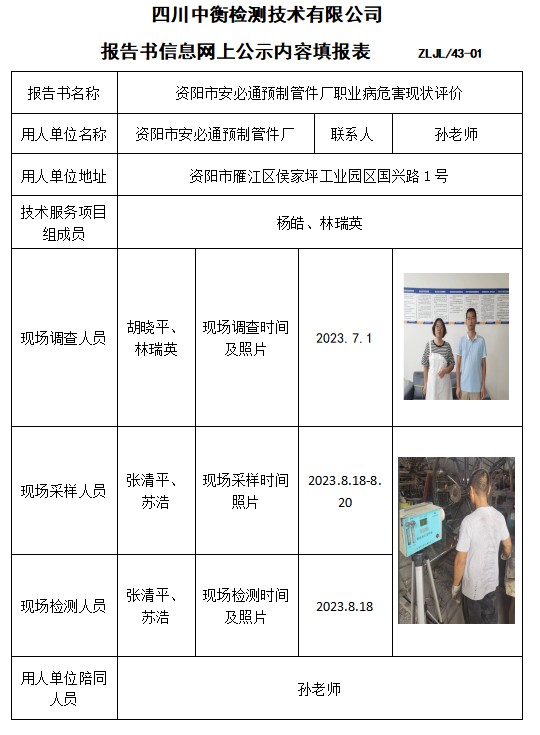 資陽市安必通預(yù)制管件廠職業(yè)病危害現(xiàn)狀評(píng)價(jià)