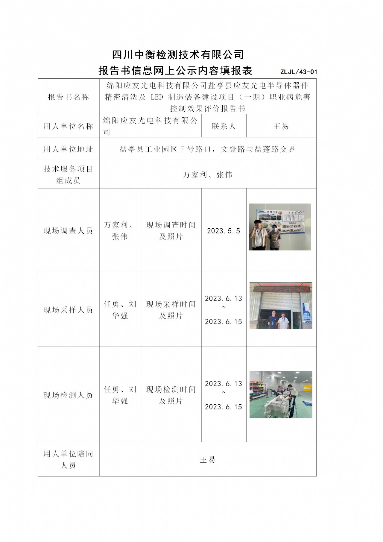 綿陽應(yīng)友光電科技有限公司鹽亭縣應(yīng)友光電半導(dǎo)體器件精密清洗及 LED 制造裝備建設(shè)項(xiàng)目(一期)職業(yè)病危害控制效果評(píng)價(jià)