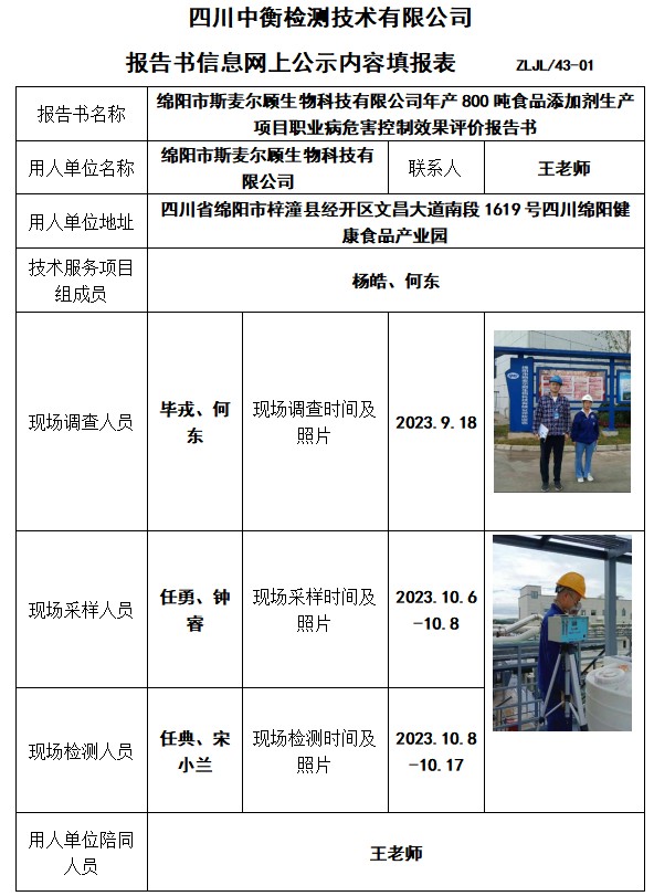綿陽市斯麥爾顧生物科技有限公司年產(chǎn)800噸食品添加劑生產(chǎn)項(xiàng)目職業(yè)病危害控制效果評(píng)價(jià)報(bào)告書