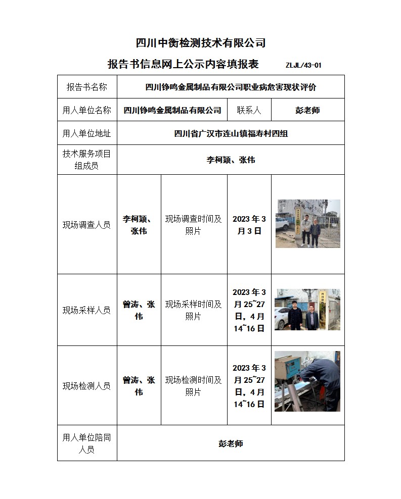 四川錚鳴金屬制品有限公司職業(yè)病危害現(xiàn)狀評價