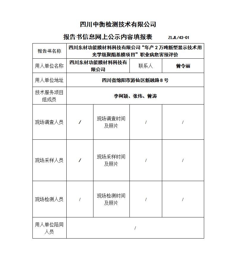 四川東材功能膜材料科技有限公司“年產(chǎn)2萬噸新型顯示技術(shù)用光學(xué)級聚酯基膜項(xiàng)目”職業(yè)病危害預(yù)評價(jià)