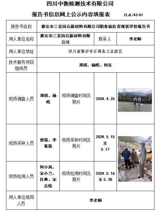雅安市三發(fā)崗石新材料有限公司職業(yè)病危害現狀評價報告書