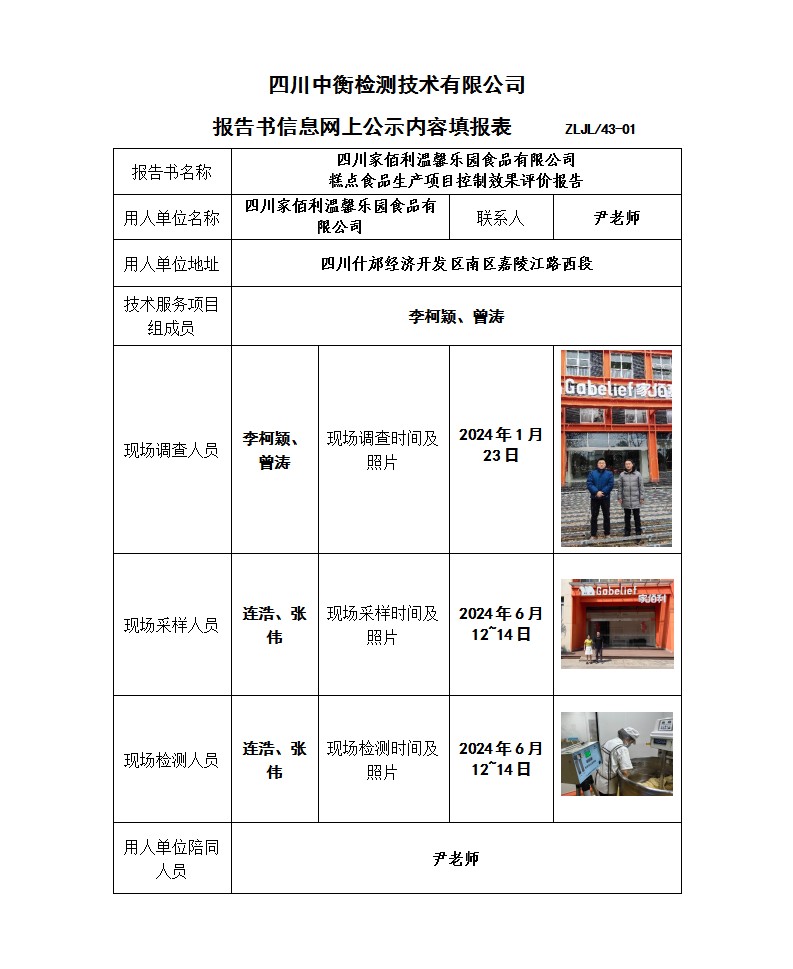 四川家佰利溫馨樂園食品有限公司 糕點食品生產(chǎn)項目 職業(yè)病危害控制效果評價報告書
