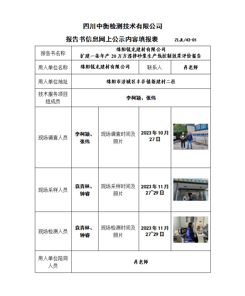綿陽銳龍建材有限公司 擴建一條年產(chǎn)20萬方濕拌砂漿生產(chǎn)線 職業(yè)病危害控制效果評價報告書