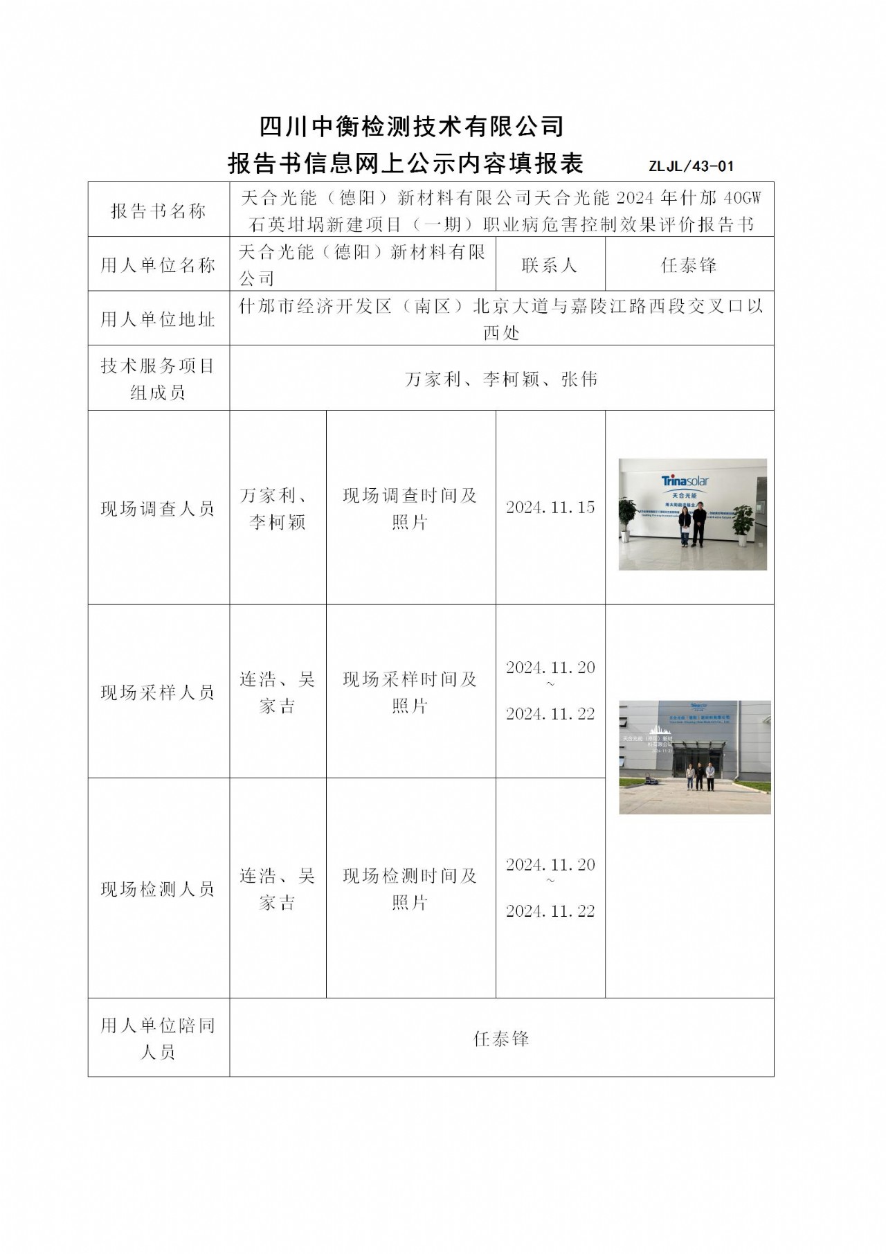 天合光能(德陽)新材料有限公司天合光能2024年什邡40GW石英坩堝新建項目(一期)職業(yè)病危害控制效果評價